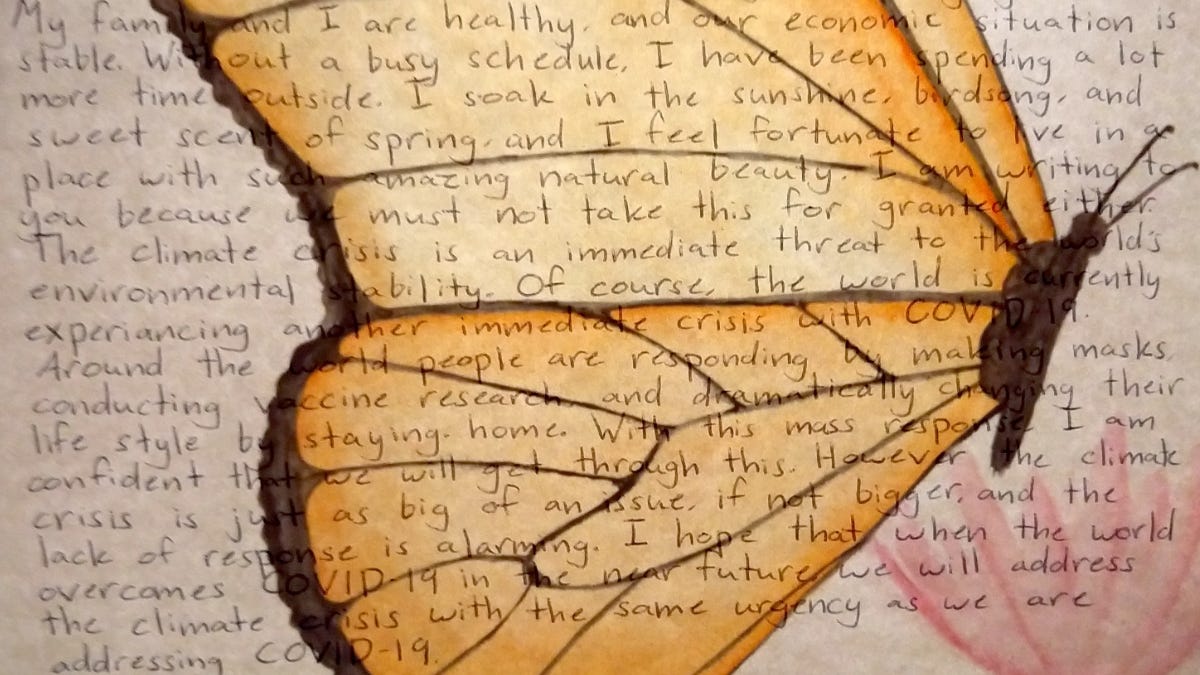 In an early workshop, one adult participant photographed and emailed his letter and drawing to his commissioner. The response he received was moving: “What a very kind and uplifting note! Thank you. I’m going to print this butterfly (did you draw it?), frame it and refer to it on camera and display it in my office & on FB. Yes, climate action needs to progress along. I will do my part.”